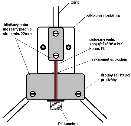 pomocí panelové PL zdířky. K živé části je připájen závěsný zářič, k