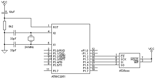 Může být 3-vodičové nebo 4-vodičové. Stejně jako u pamětí 93Cxx není důvod používat 4-vodičové připojení - piny SI (Serial In) a SO (Serial Out) můžeme připojit na jeden pin mikroprocesoru, protože všechny piny portu P1 jsou vstupně/výstupní a můžeme programově měnit jejich funkci (v/v).