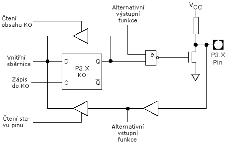 Jak ukazuje obr.4, pokud KO pinu z portu 3 obsahuje jedničku, výstupní log. úroveň pinu je dána stavem vnitřního signálu Alternativní výstupní funkce. Skutečný log.stav pinu je vždy dostupný na vnitřním signálu CPU - Alternativní vstupní funkce.