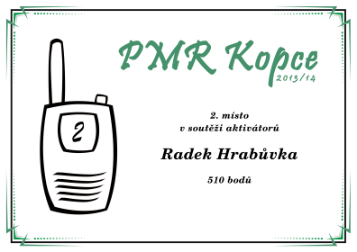 Diplom největší kopcař, 1. místo, 102 aktivovaných vrcholůDiplom 2. místo v soutěži aktivátorů, 510 bodů