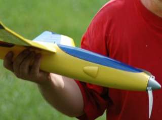 Na chalupě v jižních Čechách jsme si vybrali louku s mírným svahem a hezké počasí. Důkladněni než jindy jsme překontrolovali funkci všech serv, nastavení mixů a ovladačů na RC soupravě. Model jsme vypustili mnohem větší silou. Na svahu se hned ustabilizoval a neměl snahu dělat neplechu. Po asi 30ti metrech volného letu jsem zapnul motor na 30%. Model začal poslušně stoupat. Nastoupal jsem do 100m a provedl základní vytrimování. Nebylo ani moc třeba. Model poslouchal na jemné ovládání. Po asi 15 minutách jsem pod plnými klapkami přistál.